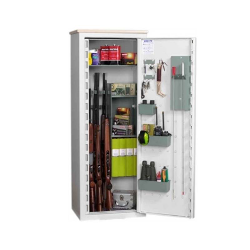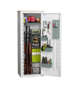 Den flexibla inredningen gör att du kan anpassa skåpet efter dina behov. Med flyttbara hyllor, dörrförvaring och justerbara pipstöd kan du organisera både vapen, ammunition och annan utrustning på ett smidigt sätt.